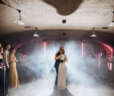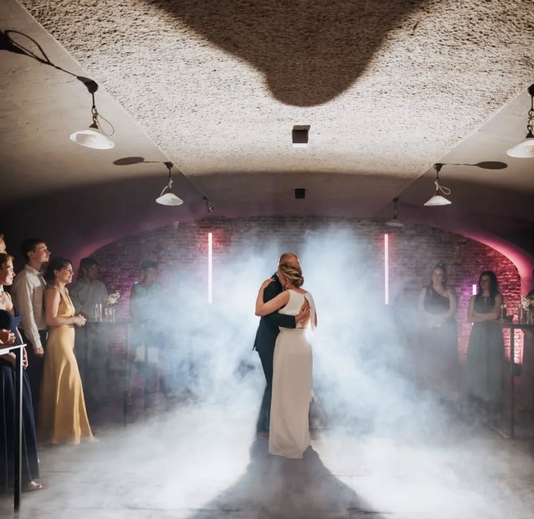 Onze dancing on cloudsmachine creeërt een dun laagje rook dat over de grond zweeft. Dansend op de wolken krijgt een openingsdans een extra feeërieke dimensie.